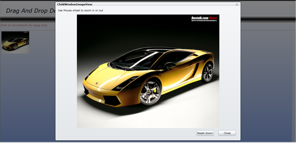 2. Khi đã Load Image ra ScollView nếu chúng ta Click vào thì sẽ có một ChildWindow hiện ra và show Phóng to tấm hình vừa chọn