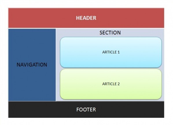 Thẻ <section> chia nội dung trang web ra thành nhiều phần chính. Mỗi <section> lại có thể có nhiều <article>. Một <article> có thể xem như một bài viết cụ thể (chẳng hạn như một blog entry rất thích hợp để đặt trong một <article>). Cuối cùng, thẻ <aside> thường đóng vai trò như một sidebar cung cấp các thông tin liên quan cho <article> chứa nó (thực tế thì bạn sẽ cần đến CSS nếu muốn hiển thị thẻ <aside> này như một sidebar. Như đã đề cập trong bài viết trước, HTML5 cố gắng tách biệt hai phần nội dung và trình bày nên các thẻ HTML5 không quy định sẵn cách thức hiển thị mà nhường lại công việc đó cho CSS. Tuy vậy, việc sử dụng các thẻ mới vẫn giúp cho code HTML dễ đọc hơn và hỗ trợ tối ưu công cụ tìm kiếm)