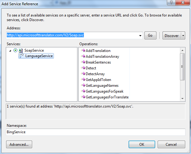 – Sau đó paste đường link của Bing Translator service: http://api.microsofttranslator.com/V2/Soap.svc vào thanh Address –> chọn go –>đặt tên ở namespace là BingService –> chọn OK: