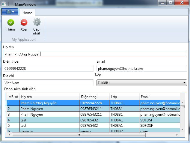 Lưu ý : sau các thao tác chúng ta phải sử dụng hàm SubmitChange(), để gửi thông thin thao tác trên dữ liệu lên Database, nếu ko gọi hàm này dữ liệu chỉ có thể thêm sửa xóa tạm thời nhưng phía Database hoàn toàn ko đổi