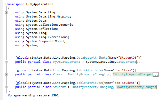 – Sau khi tạo xong LINQ to SQL Class thì hệ thống sẽ sinh ra những lớp tương ứng