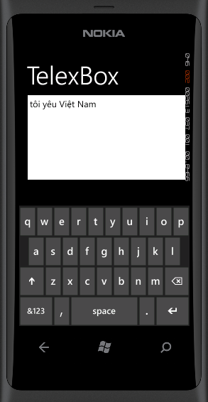 – Chính vì vậy, dưới sự góp ý của bạn bè, hôm nay mình xin cho ra mắt một Control mình gọi nó là TelexBox giúp chúng ta có thể gõ tiếng Việt theo kiểu Telex trong ứng dụng Windows Phone.