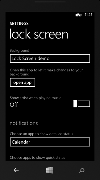 Bây giờ chúng ta built và chạy ứng dụng để thực thi hàm ChangeLockscreen, sau đó quay trở lại màn hình Start của Emulator –> chọn Settings –>Lock screen –> chọn background sẽ thấy tên ứng dụng của chúng ta