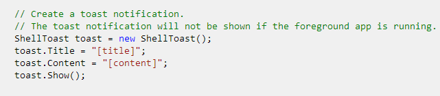 Khi developer thêm đầy đủ thông tin ShellToast thì gọi phương thức Show để hiện Toast. Tuy nhiên phương thức Show này chỉ dành cho Toast Nofitication local.