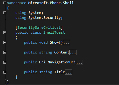 Toast được hiện hóa qua đối tượng lớp ShellToast thuộc namespace Microsoft.Phone.Shell .
