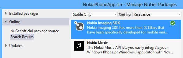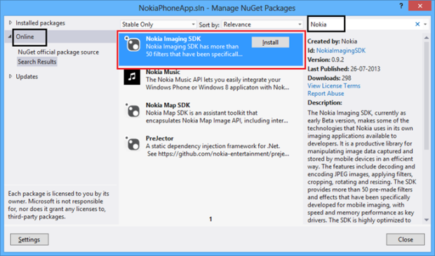 Kế tiếp chọn vào tab online và gõ vào Khung Search từ Khóa “Nokia”, ngay lập tức hệ thống sẽ search online và trả về kết quả Nokia Imagine Sdk