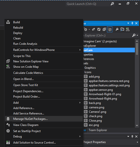 chọn Right-Click vào project->Manage NuGet Packages :